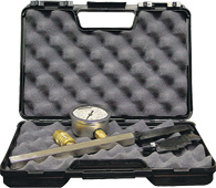 Chrome plated brass handle, with two injection molded blades (straight/notched), quick-connect fitting, 0-160 psi liquid-filled pressure gauge, computation table and case